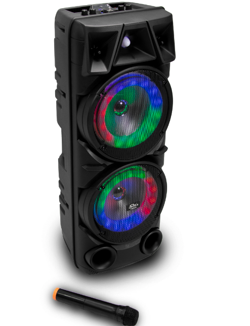 دو عدد بلندگوی 8 اینچ این اسپیکر به همراه ارتفاع حدودا 70 سانتی متری و رقص نوری که قابلیت تغییر حالت دارد به شما یک اسپیکر زیبا و در عین حال قدرتمند تقدیم می کند که می تواند در تمام مراسمات.تفریح ها و جشن ها چه در فضای باز و چه در فضای بسته شمارا همراهی کند و تجره لذت شنیدن موسیقی با صدای بلند و شفاف را به شما بدهد.