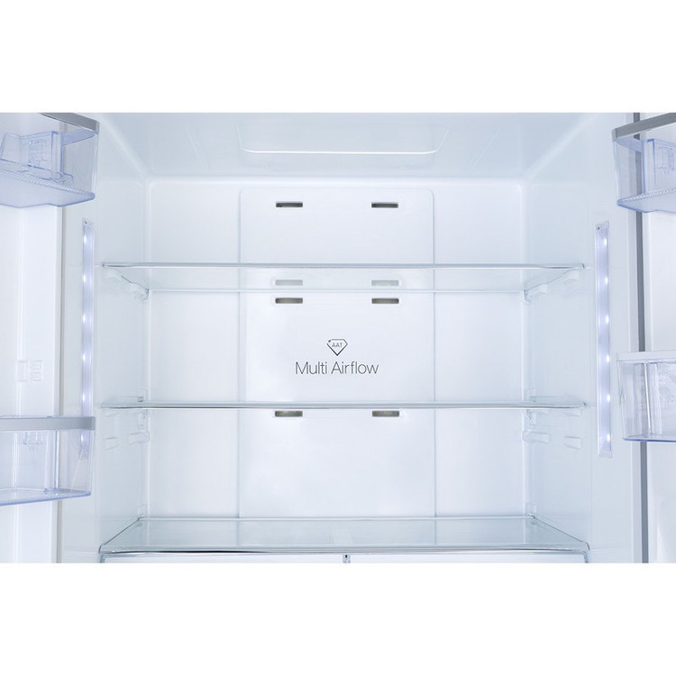 یکی از نکات جالب در این مدل، فناوری گردش هوای چندگانه است. این فناوری جریان هوای سرد را از طریق دریچههای زیر طبقات یخچال به وسیلهی سنسورهای معینی تنظیم میکند تا هوای یکنواخت و خنک در فضای داخلی یخچال ایجاد شود. این ویژگی به حفظ تازگی مواد غذایی و جلوگیری از تغییرات دما در انواع مختلف مواد غذایی کمک میکند.